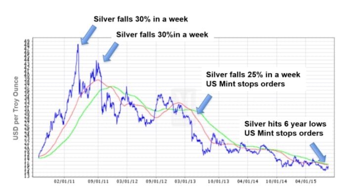 - Mid-2015 – paper prices extremely low; U.S. Mint stops taking orders, sales surged