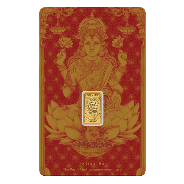 Celebrate the spirit of Diwali with this beautifully crafted 1 gram gold bullion minted bar honouring and depicting Lakshmi, the revered Hindu goddess of wealth, fortune, and prosperity.
