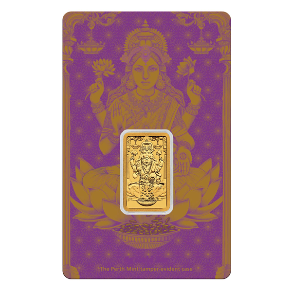 Celebrate the spirit of Diwali with this beautifully crafted 1 gram gold bullion minted bar honouring and depicting Lakshmi, the revered Hindu goddess of wealth, fortune, and prosperity.